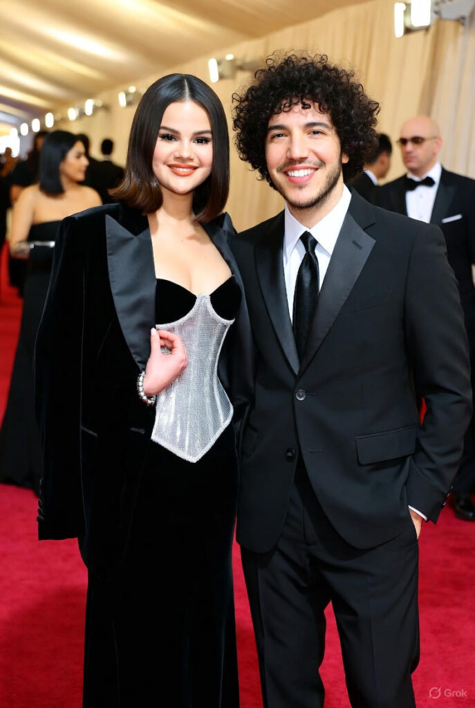 Fast-forward to October 18 at the Academy Museum Gala, where Selena and Benny made their newlywed debut. She channeled old Hollywood in a black velvet Versace corset gown with silver glitter accents—cinched, sultry, and showing off that post-wedding glow. A velvet blazer draped over her shoulders added edge, while her sleek updo and diamond studs kept it chic. Benny matched her energy in a tailored black suit, the two arm-in-arm and beaming like they just won the romance lottery.